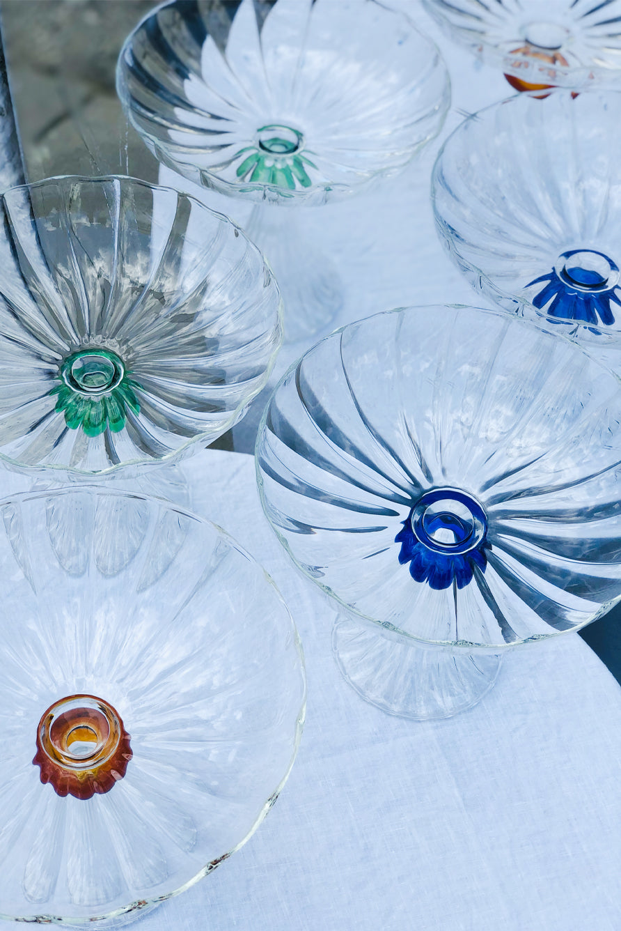 A colourful central accent pops against its classic form and clear, sparkling glass and is inspired by Italian design.